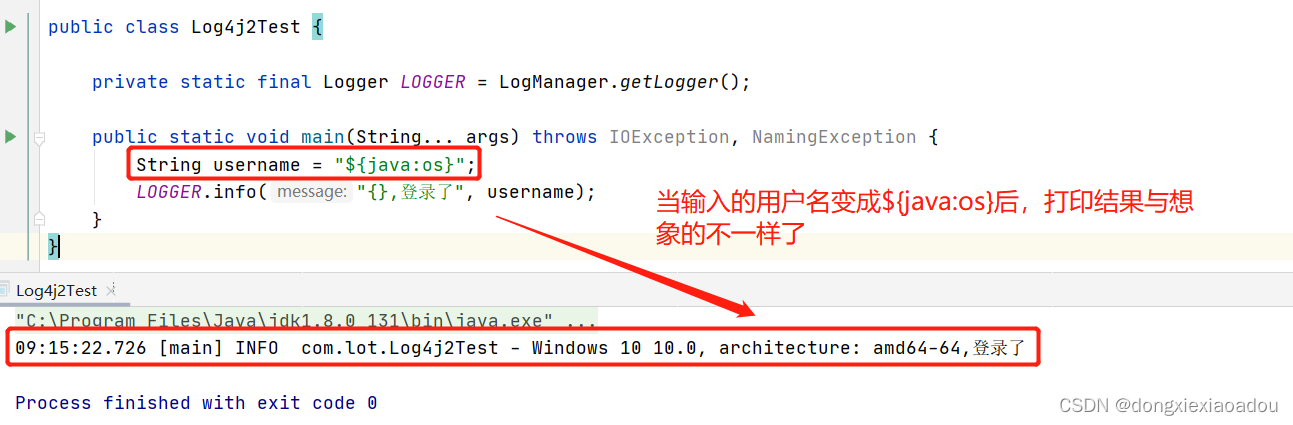但当我们传入一些特定参数的时候,打印结果就与期待结果有点不一样了,我们用${java:os}登录打印的却是本机系统信息。